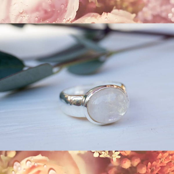 This is a stunning oval natural moonstone set into a solid sterling silver 925 ring.